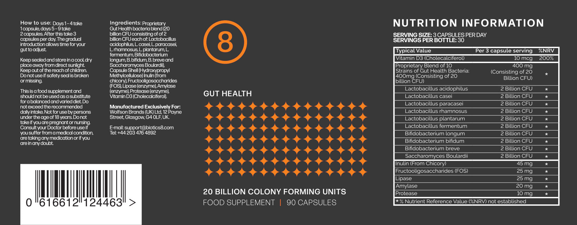 Biotics 8 delivers 10 probiotic strains with 20 billion CFUs, plus digestive enzymes and vitamin D to help restore gut microbiome for pinnacle health!